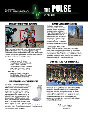 The Winter 2025 edition of The Pulse covers the School of Health and Kinesiology intramural program, ropes course recertification, Gym-Masters performances, and the proposed Giving Day Project.